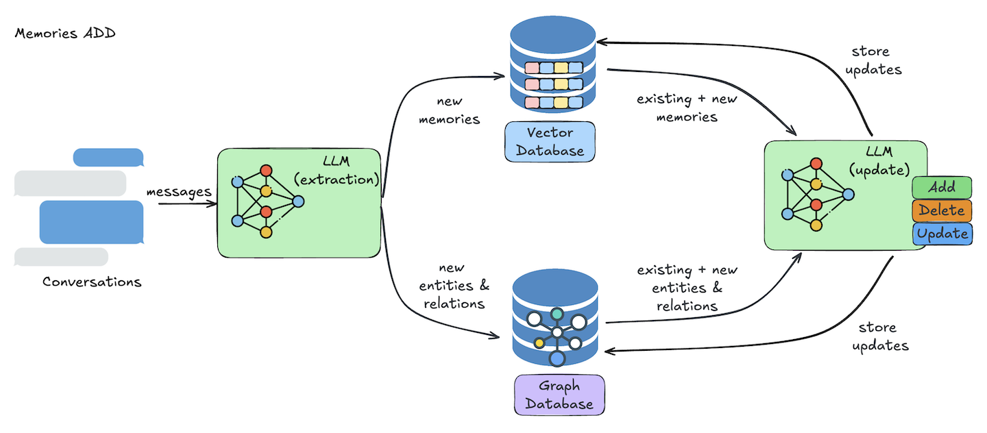 - Memory Storage The result is stored in a vector database (for semantic search) and optionally in a graph structure (for relationship mapping).